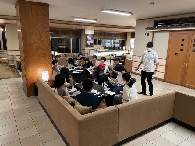 1日目を楽しく過ごした6年生でした。担任の先生から、これからの部屋の過ごし方及び明日の朝の注意点を真剣に聞く部屋長さん達です。