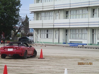次に、8の字走行です。速度が上がるにつれて、遠心力がかかり8の字が大きくなっていきました。プロレーサーの山野氏が運転するとドリフト状態になり、8の字が小さくなります。山野氏の運転技術はとても素晴らしかったです。