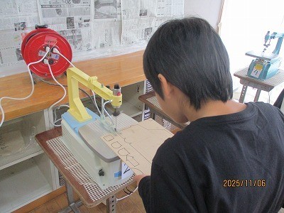 5年生が、電動糸ノコギリに挑戦していました。アイディアを板に下書きし、丁寧にかつ慎重に糸ノコギリを扱っていました。