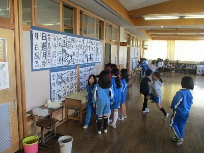 2年生が、5年生の廊下に集まっています。上級生の書いた「書き初め」を見学していました。来年度から3年生になる2年生です。毛筆の授業が始まります。上級生の字を参考に、毛筆の授業を楽しみにしてください。