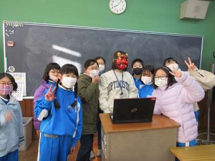 早速そのクラスに行ってみると、鬼と子ども達が楽しそうに会話をしていました。ハイブリッドで参加している児童もいきなり鬼が映りびっくりしていましたが、すぐに笑顔に…