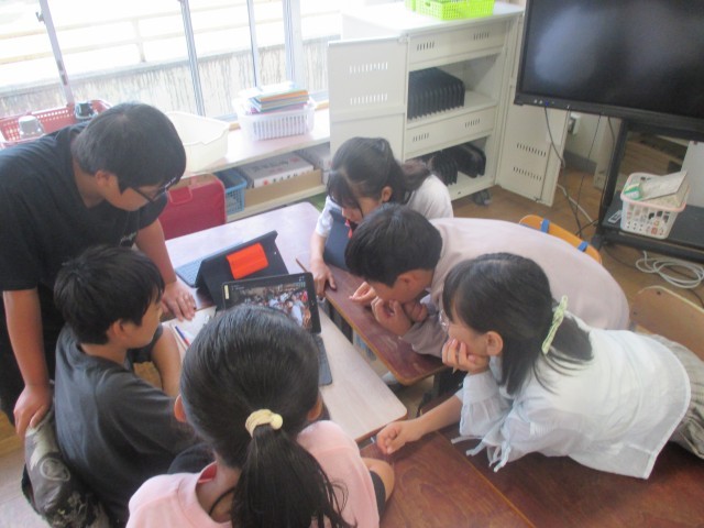 総合的な学習の時間に5,6年生が交流授業を行いました。6年生が5年生にiPadを使って自分たちの体験を説明していました。5年生は興味津々に6年生の話を聞いていました。