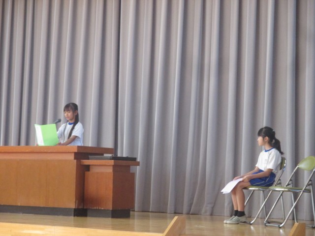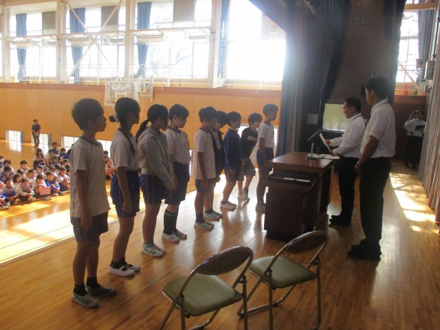 前期終業式が行われました。2年生と4年生の代表児童より前期を振り返って、頑張ったこと、できたことについて発表がありました。また表彰では本をたくさん読んでいる児童への表彰が行われました。
