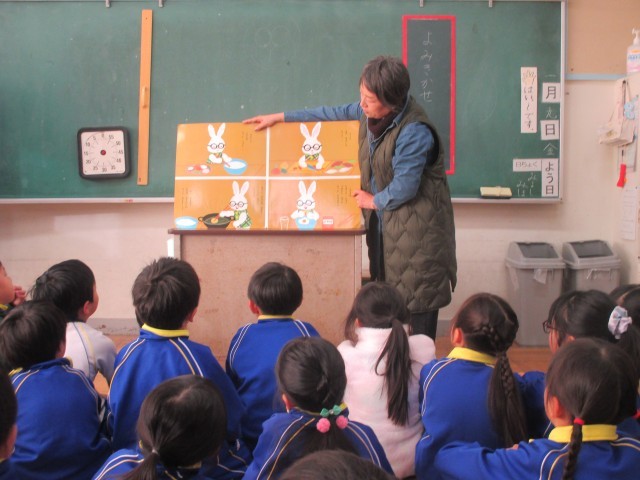 朝の読み聞かせの様子です。3名のボランティアの皆様、寒い中ありがとうございます。読み聞かせを通して、落ち着いた一日のスタートを切ることができています。