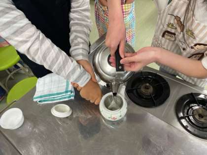 身支度を整え、コンロの使い方やお茶の入れ方を確認し、上手にお茶を入れていました。