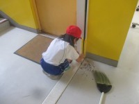 掃除の時間の様子です。2年生の1階廊下掃除です。隅々まできれいにしようと、細かいところに気付きながら活動に取り組んでいます。根気強く、ものごとに取り組む力が育っています。