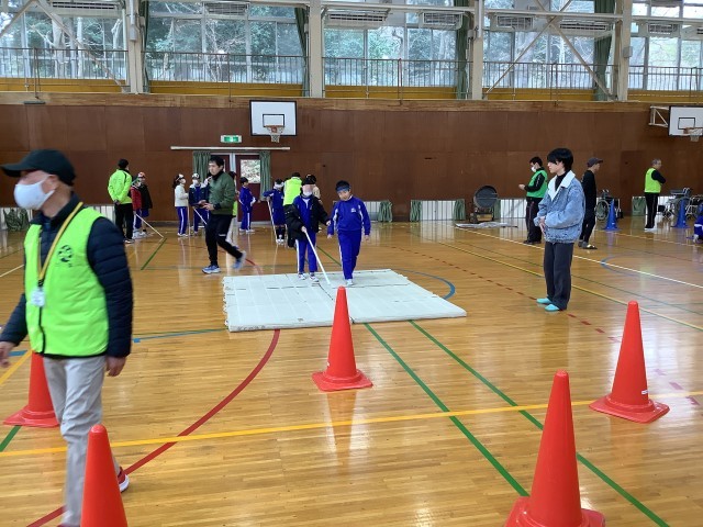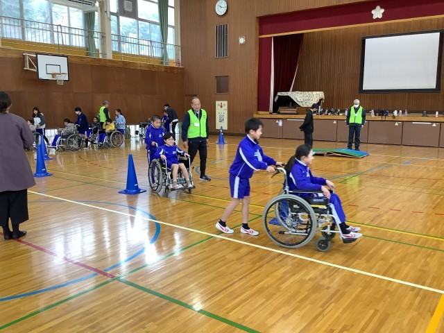 2時間目は、体育館で「車椅子体験」と「白杖体験」をしました。車椅子に乗って障害物を越えたり、目隠しをして杖を持って歩く体験など、初めて経験する児童も多かったようですが、友達と協力し合って取り組んでいました。