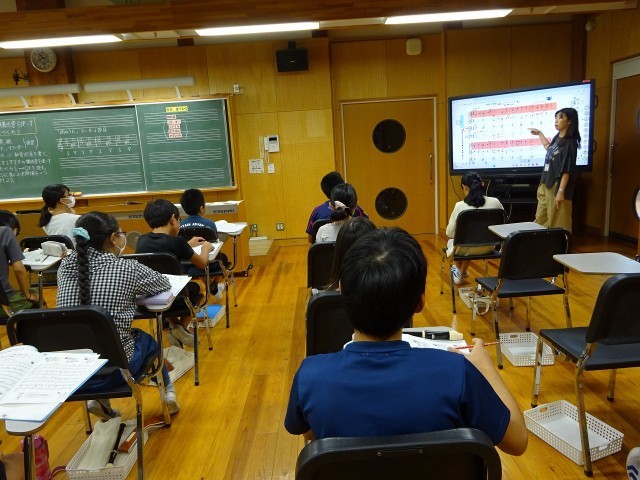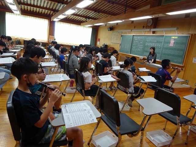 6年生は、旋律をつくる音楽科の授業です。音と音の重なりを聴いて考えていきます。リコーダーを活用しながら課題に向き合う子ども達です。