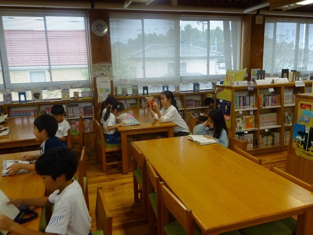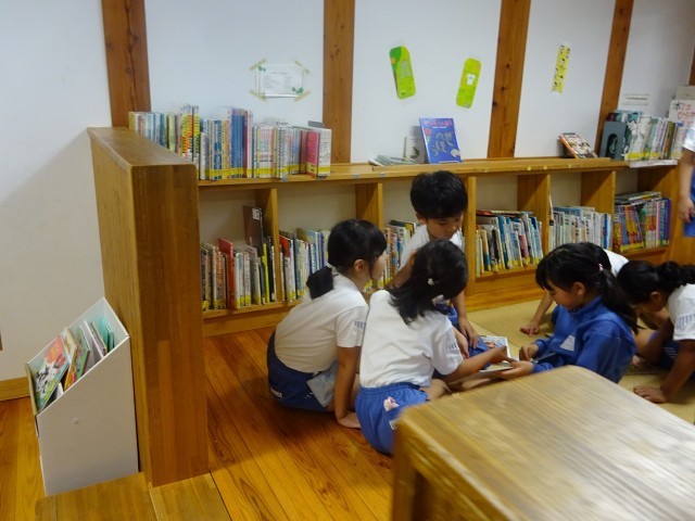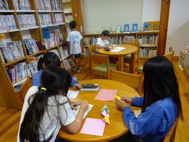 昼休みは、雨天のため外遊びができません。そんな時の人気スポットは図書室です。折り紙を楽しむグループもありました。思い思いに過ごしています。