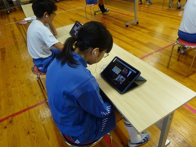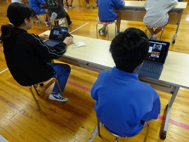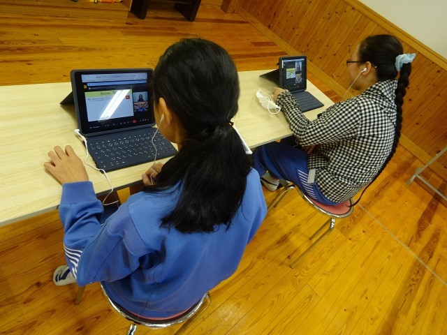 午前中いっぱい6年生の4学級が順番にオンライン英会話に挑戦しています。落ち着いて相手とのコミュニケーションを楽しみながら英語に親しむ6年生です。