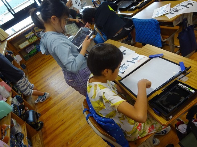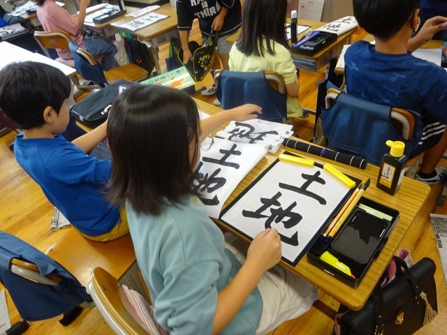 4年生が毛筆作品づくりに集中して取り組んでいました。課題は「土地」。縦画と横画のバランスが大切です。筆をしっかりと立てていざ!