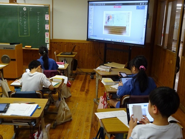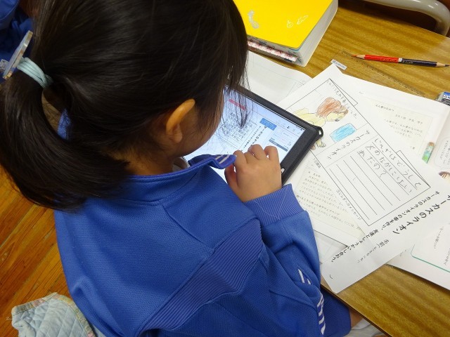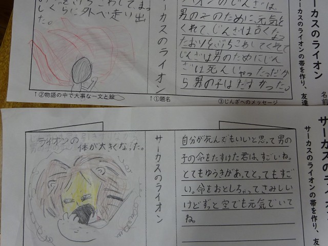 3年生の国語科で、「サーカスのライオン」について、本の帯を子供たちが作りました。紹介文も上手です。そして何よりもイラストが素敵。今日は、タブレット端末を活用して、互いに作った帯を見合っていました。