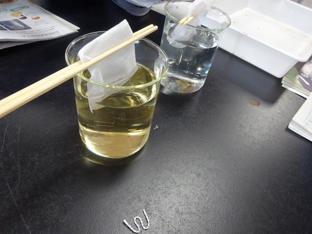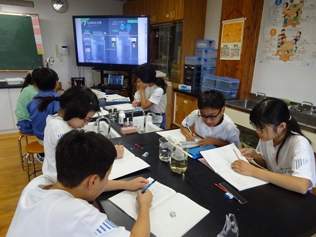 5年生が何やら真剣にビーカーを見つめていました。理科の実験で、コーヒーシュガーと食塩の溶け方を調べていました。どちらが早く溶けるのかな?