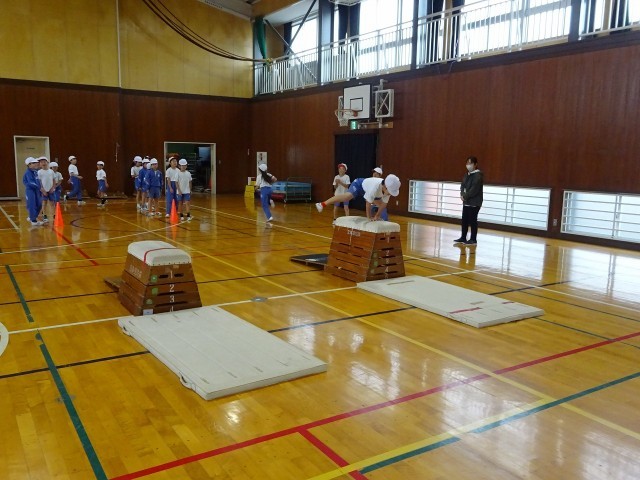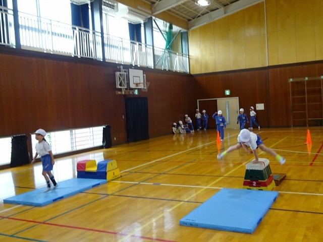体育館では、2組が跳び箱運動に挑戦していました。飛び方のフォームがとってもきれいなんです!