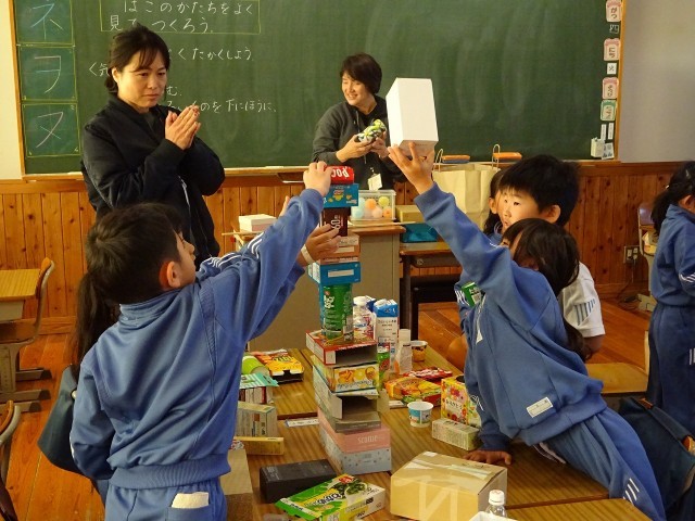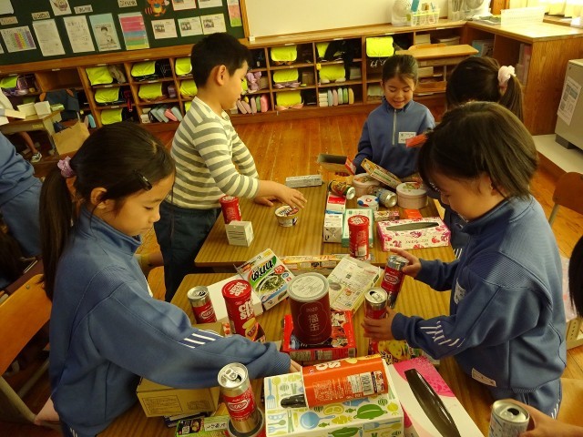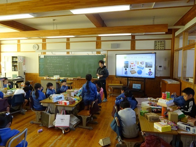 1年2組の算数科の授業風景です。今日の課題は「はこのかたちをよくみてつくろう」。家から各児童が持参した様々な形を触ったり見たりしながら立体図形の機能や特徴をとらえます。箱で様々な形を作り、遊びながら理解の基礎となる感覚を豊かにしていきます。一生懸命に活動しながら学びを深める1年生です。