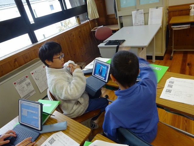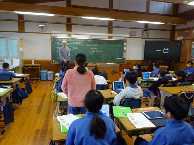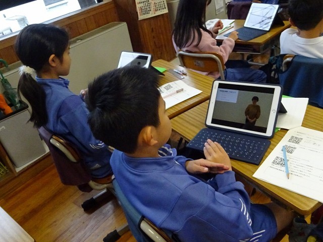 1校時、4年1組の総合的な学習の時間の様子です。今日の課題は「手話を知り、手話で会話してみよう」。手話と日本語対応手話の違いを理解し、様々な手話表現を調べました。単語をつなげて会話にすることも理解した子ども達。興味関心が広がった様子です。