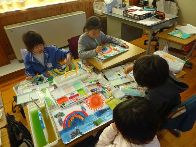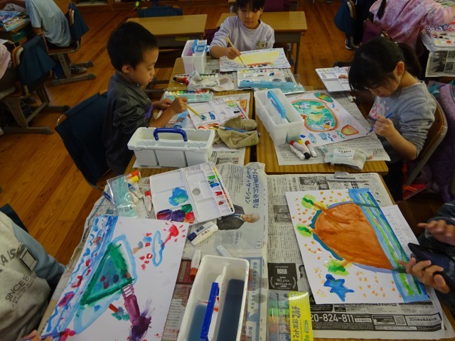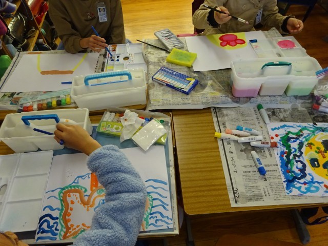 2年生が「絵の具の島」を課題に伸び伸びと絵画作品をつくっていました。個性が光る力作ばかりです。