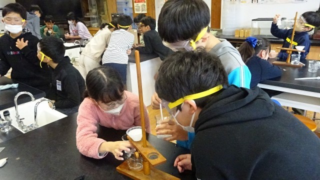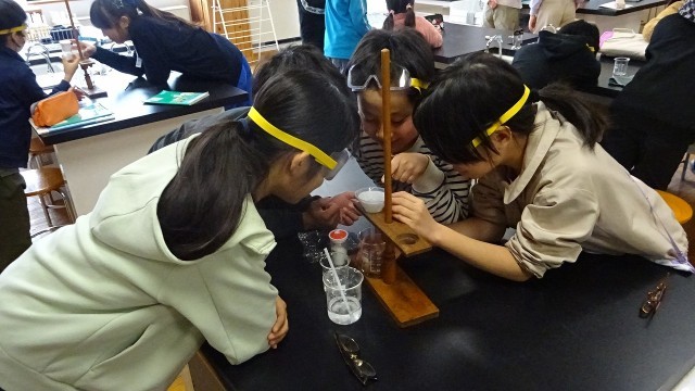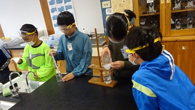 準備万端で実験に取り組む5年生。食塩を濾過する学習をして、今度はミョーバンに挑戦です。実験の進め方がとても上手!