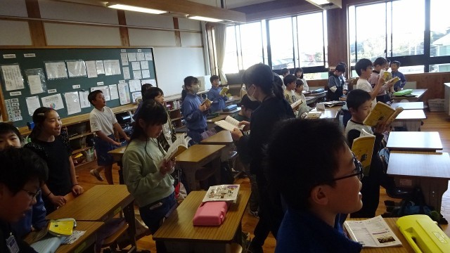 1組の教室から素敵な歌声が響きます。GReeeeNの「キセキ」を歌う子ども達。上手です!! 4組では、飯沼干拓について真剣に学び合う様子が見られました。水害についても考えが広がりました。