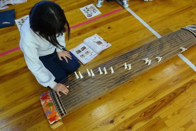 今日は、音楽科の学習で、4年生が琴体験をしています。外部講師として櫻井先生をお迎えしています。琴を実際に触って弦を弾き音を出す、貴重な体験です。櫻井先生の琴演奏もお聴きしました。とっても素敵な時間です。