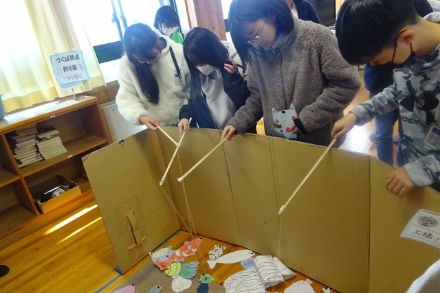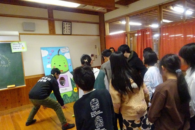 市内の高校生も運営に協力してくださいました。生徒さん制作のゲームコーナーも子ども達が集まって楽しく体験させていただきました。釣堀とマスカット星人です。