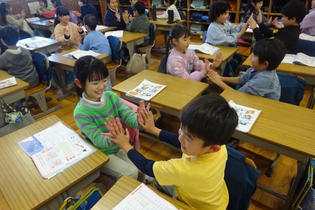 2年生の音楽科の授業風景です。楽しい曲が流れていたので教室をのぞいてみると・・・。音楽に合わせて身体表現です。膝で1回友達と手を合わせて2回、歌いながらリズムを感じます。前奏部分は踊っちゃう?