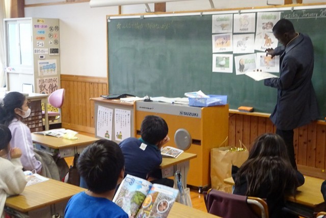 3年生の外国語活動の学習風景です。動物や昆虫の単語を覚えて簡単な英会話に挑戦です。What's this?の問いにThis is~ 元気に答える3年生。ALTの発音を上手に繰り返します。