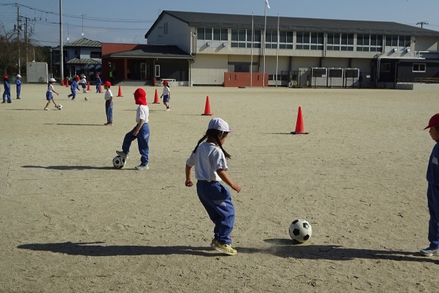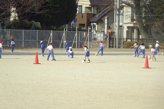 校庭では、1年生が一生懸命にサッカーの練習です。友達にパスしたり友達にドリブルしながら近づいていったりとボールに慣れることから始めていました。朝の寒さが嘘のようにぽかぽかの陽気の中で元気いっぱいに身体を動かしていました。