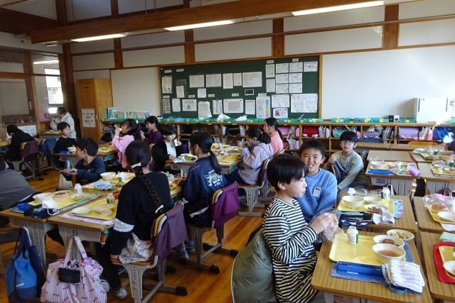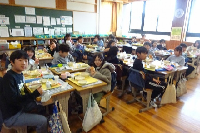 今日の給食はパンです。ペンネやハンバーグも出ました。みんなが大好きな守谷の飲むヨーグルトもあって、大喜び。