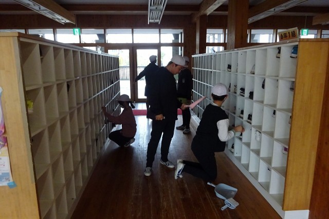 月曜日の清掃活動です。高学年生がとても働きます。昇降口前に溜まった落ち葉や砂をきれいにしたり、廊下を隅々まで掃いたり、靴箱を丁寧に拭いたり・・・。下級生にとっては、素敵な手本になっています。