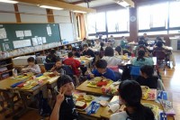1年生の教室から楽しい英語の歌が聞こえてきます。のぞいてみると、身体全体を動かしながら英語で歌っている1年生。英単語に親しみながら、今日は好きな食べ物紹介から学習をスタートさせました。