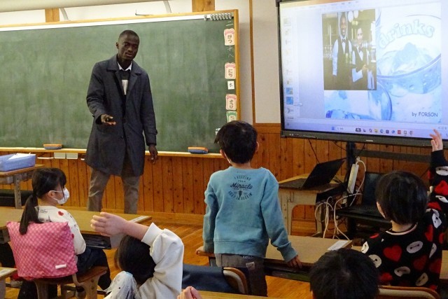 1年生の教室から楽しい英語の歌が聞こえてきます。のぞいてみると、身体全体を動かしながら英語で歌っている1年生。英単語に親しみながら、今日は好きな食べ物紹介から学習をスタートさせました。