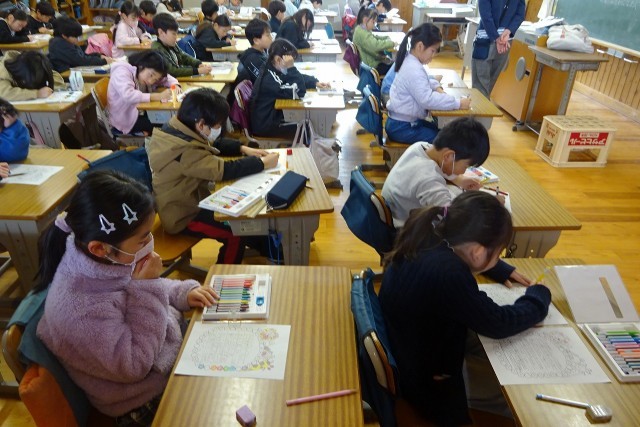 2年生が一生懸命に何かを書いていました。よく聞くと、家族に感謝の気持ちを表す手紙を書いているそうです。丁寧にイラストに色を付けて仕上げていました。感謝の気持ちを表現すること、大事ですね。