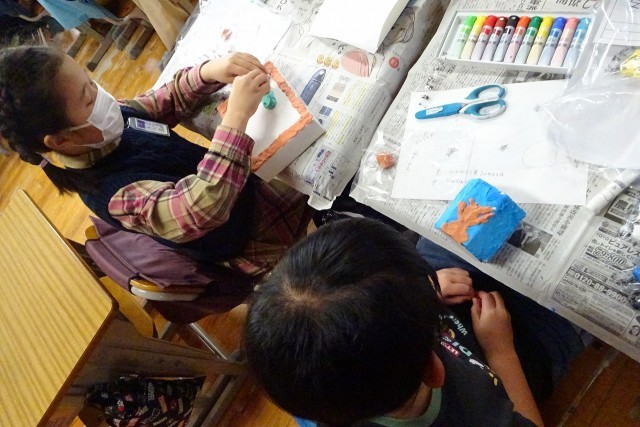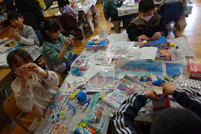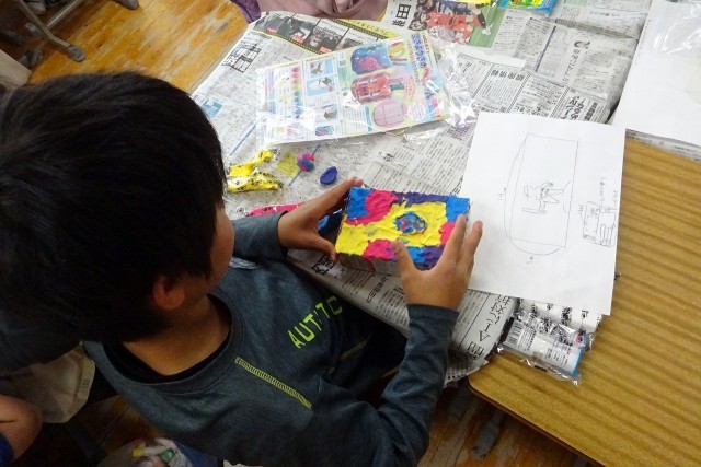 とっても楽しそうな3年生の教室。紙箱に色を付けた粘土を貼っていきます。世界に一つのマイグッズを作っていました。ペン立てかな?飾り箱かな?みんなの素敵な発想が形になっていきます。