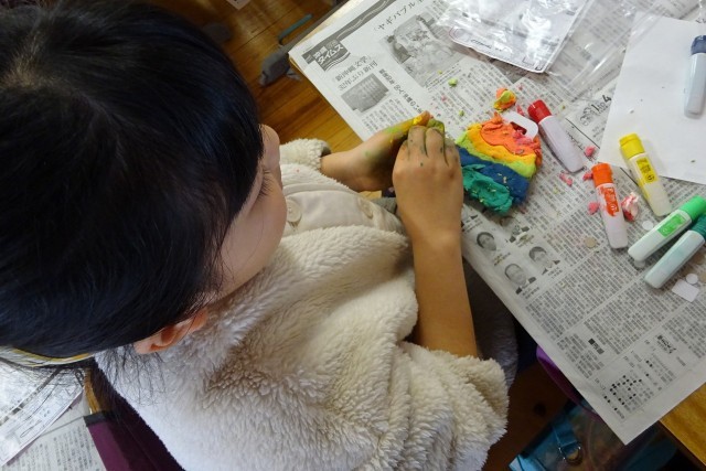 夢中で作品制作に取り組む2年生。「まごころメダル」を作っているそうです。みんなカラフルで可愛い!