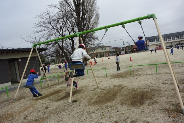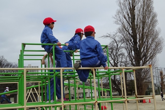 みんながとても楽しみにしている業間休み。思い思いに楽しい時間を過ごしていました。「先生!撮って!」ポーズをして待ち構える鉄棒少年発見!