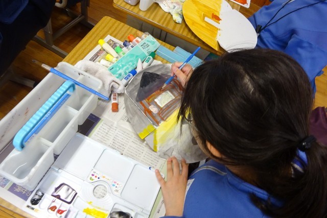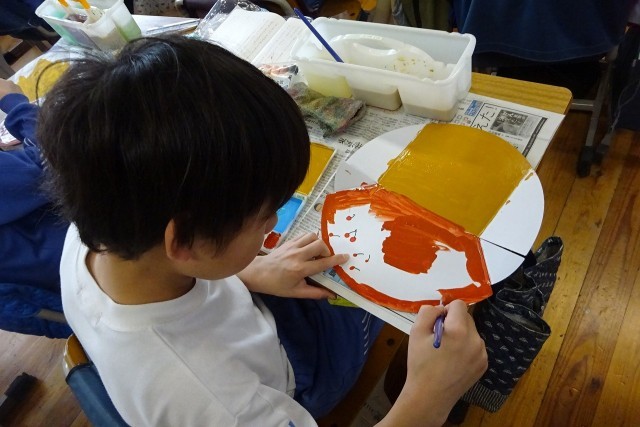 4年生が面白い形の紙に作品をつくっています。聴いてみると、本のお気に入りの場面を作品に表現するそうです。絵を描いて彩色し、立体の形をつくります。みんな集中して作品に向き合っていました。