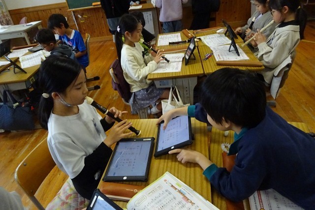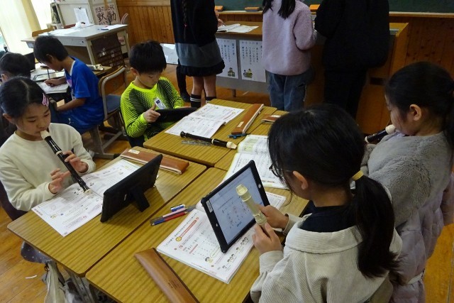 リコーダーで音出しをしながら確認する3年生。3つの音をつかっておはやしをつくっていました。一人一人がつくった音をグループの友達とつなげていきます。自分の考えをしっかりともって、友達と交流しながら考えを深める子ども達。一生懸命に学んでいます。