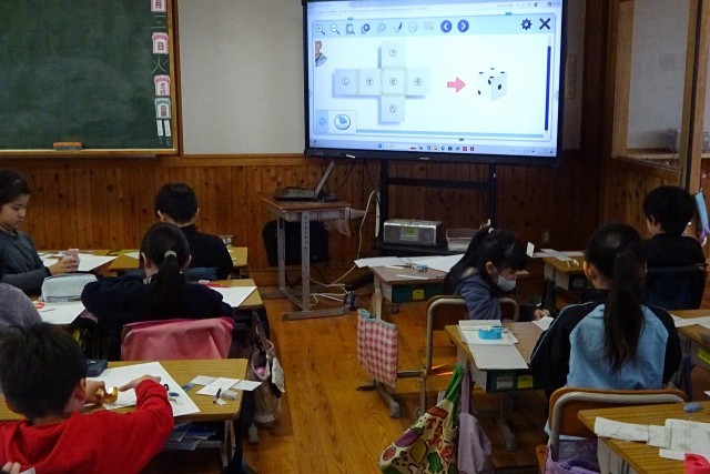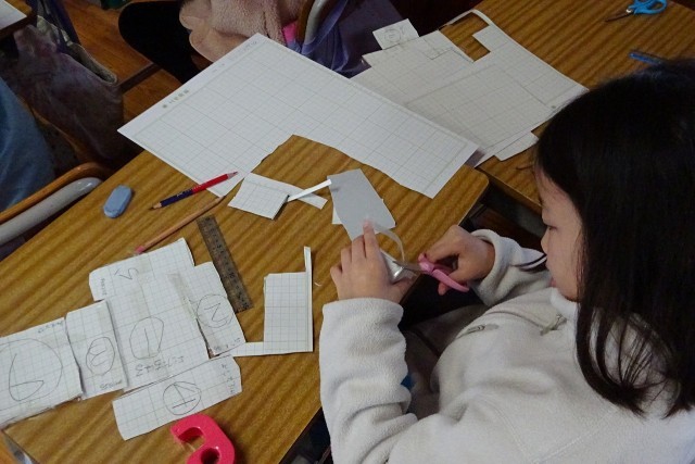 紙を切って夢中になって作業する2年生。サイコロを作るようです。先生からは「ここの数とここの数を合わせるといくつになるの?」と声がかかっていました。いくつになったかな?