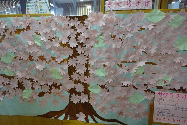 図書室に早くも満開のサクラが咲いています。卒業までカウントダウンになった6年生に向けた下級生のメッセージです。図書司書の先生から「サクラがいっぱいで貼りきれないのでは。」と嬉しい悩みがありました。みんなの温かい思いが溢れます。因みに葉の部分は、6年生から下級生へのメッセージです。さあ、守小のサクラ満開!