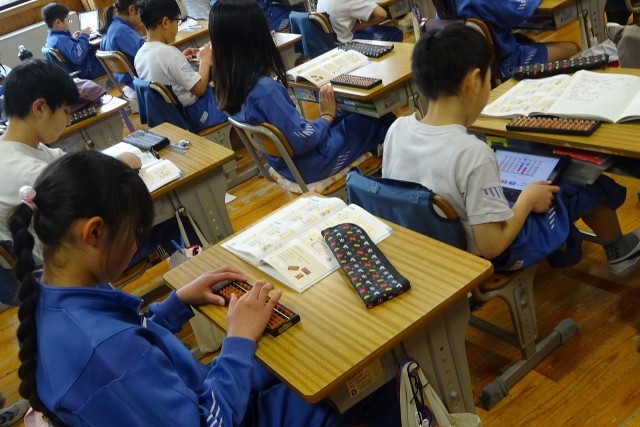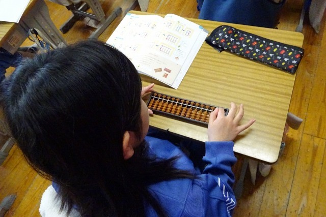 3年生が珠算学習に取り組んでいました。人差し指や親指を上手に使って珠を動かします。先生の話をよく聴いていました。