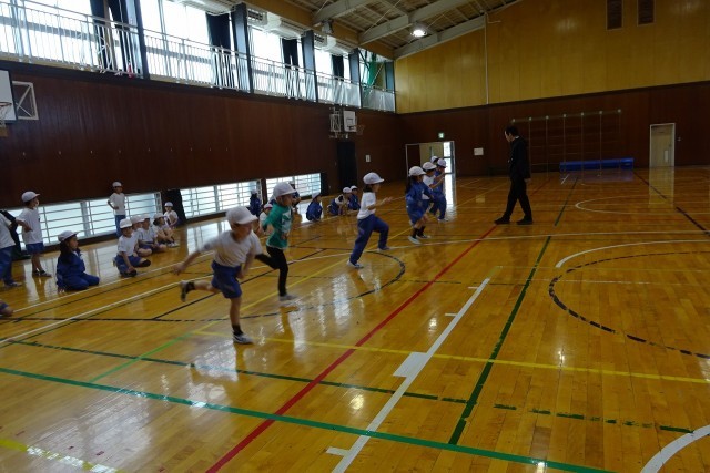 2年生の体育科の授業風景です。体育館で2組3組が合同で身体ならし運動に取り組んでいました。