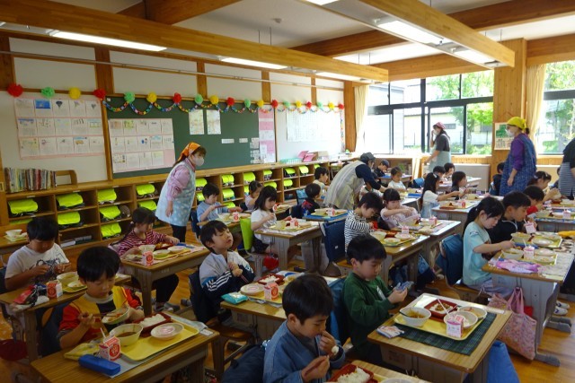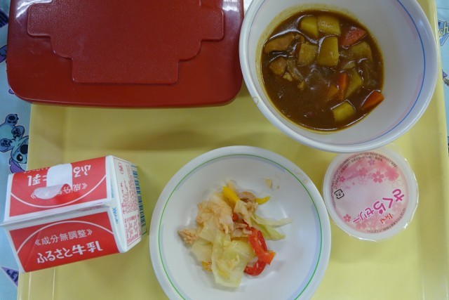 1年生は、今日が初めての小学校での給食です。カレーにサラダ、サクラゼリーも付いていました。「おいしい!」思わず声が出ます。ご飯にカレーをかけて、スプーンを使って・・・みんなおいしくいただきました!