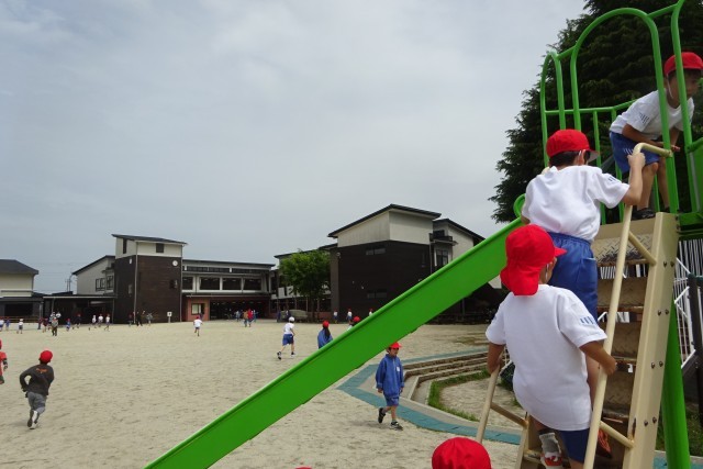 昼休みの様子です。1年生も外遊びを元気いっぱい楽しんでいます。滑り台やシーソーが1年生に人気です。滑り台には行列が・・・!