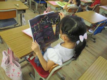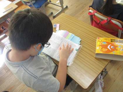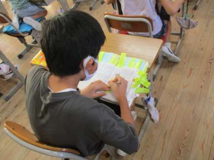 付箋いっぱいの辞書をみつめ言葉の意味を調べる子、本の世界に入り混み読書をする子、ちょっとした時間を活用してのこのような姿に、「上手な時間の使い方」だと感心させられました。