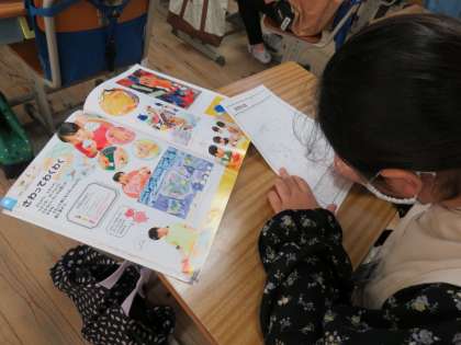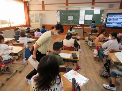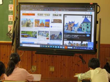 電子黒板に映し出された海外の建物を参考にして描いたり、虫や動物などをモチーフにした家を描いていたりと、無限の想像力を膨らませる子供たちの姿が大変印象的でした。