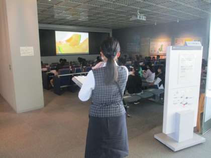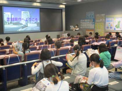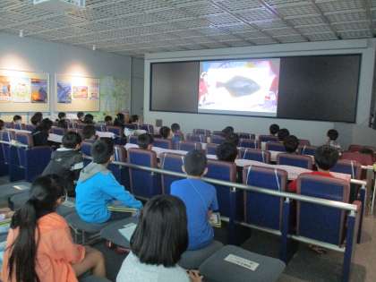 県庁舎2階にある県政シアターで、本県の名所や産業等々紹介してくれる映像を観る子供たち。