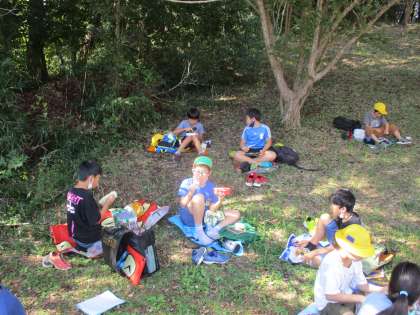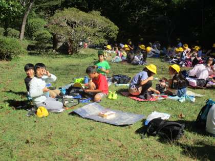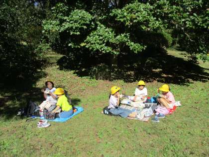 青空の下、楽しそうに笑顔でお弁当を食べる子供たちの姿が印象的でした!