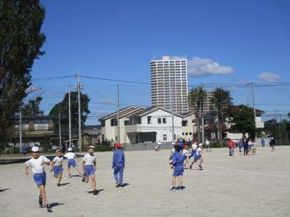 青空の下、校庭で元気よく遊ぶ子供たち。