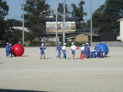それぞれの学級で、一つの大玉を、力を合わせて運びます。